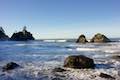 On the other side, pass a sign that lists the distance to Hidden Beach at one mile. If you want to hike farther, Klamath River Overlook is four miles away. Proceed south down Coastal Trail and exit the creek-shouldering thicket for your first ocean views. Wilson Beach, at the south end of False Klamath Cove, is to your right. Look up this long slowly curving cove. Large driftwood forms a barrier at the back of the beach. Wilson Beach looks like the type of place you might discover elephant seals stretched out on the sand. Gaze out from the beach toward rock islands just off the coast.