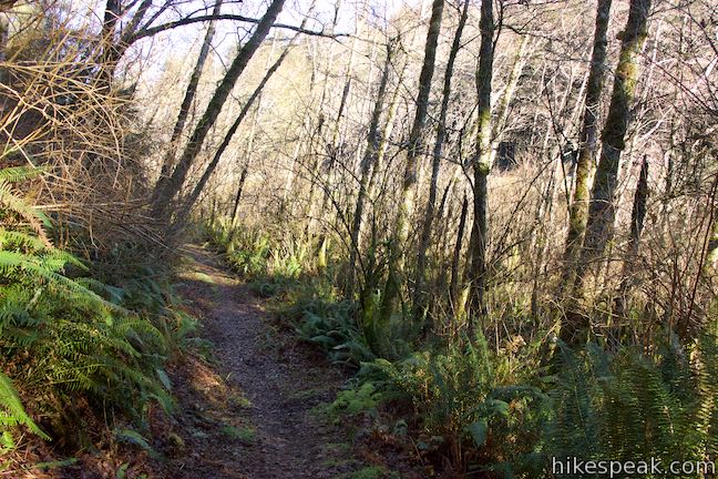 Begin up the trail through an arch of willows, alders, and oaks. Come to a split after less than a tenth of a mile. A less-worn trail parts to the right, next to a sign posting that it leads to beach access and a northern section of Coastal Trail. Bear left to continue with this hike, crossing a footbridge over Lagoon Creek.